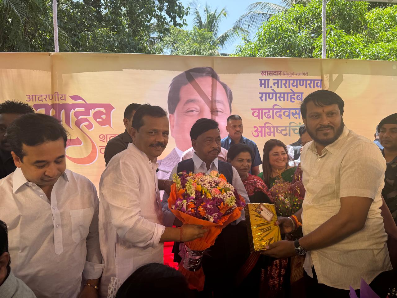 कोकणचे भाग्यविधाते खासदार, माजी मुख्यमंत्री नारायण राणे, यांचा जन्मदिन अमृत महोत्सवी म्हणून साजरा केला जात आहे. वेगवेगळ्या मान्यवरांनी भेट घेत त्यांना यावेळी शुभेच्छा दिल्या. शिवसेना जिल्हाध्यक्ष संजू परब यांनी कणकवली येथे भेट घेत त्यांना जन्मदिनाच्या शुभेच्छा दिल्या. यावेळी पालकमंत्री नितेश राणे ,जिल्हा बँक संचालक विद्याधर परब उपस्थित होते..