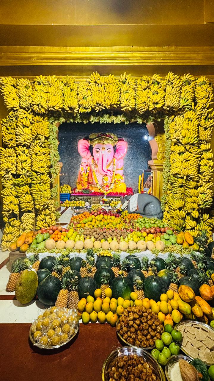 संपूर्ण फुल आणि फळांनी सजलेली ही आरास डोळ्यांच पारणं फेडत आहे. अतिशय सुरेख अशी ही आरास केली गेली आहे.येणाऱ्या भक्तगणांना ही आरास मनाला दिपवून जाते.