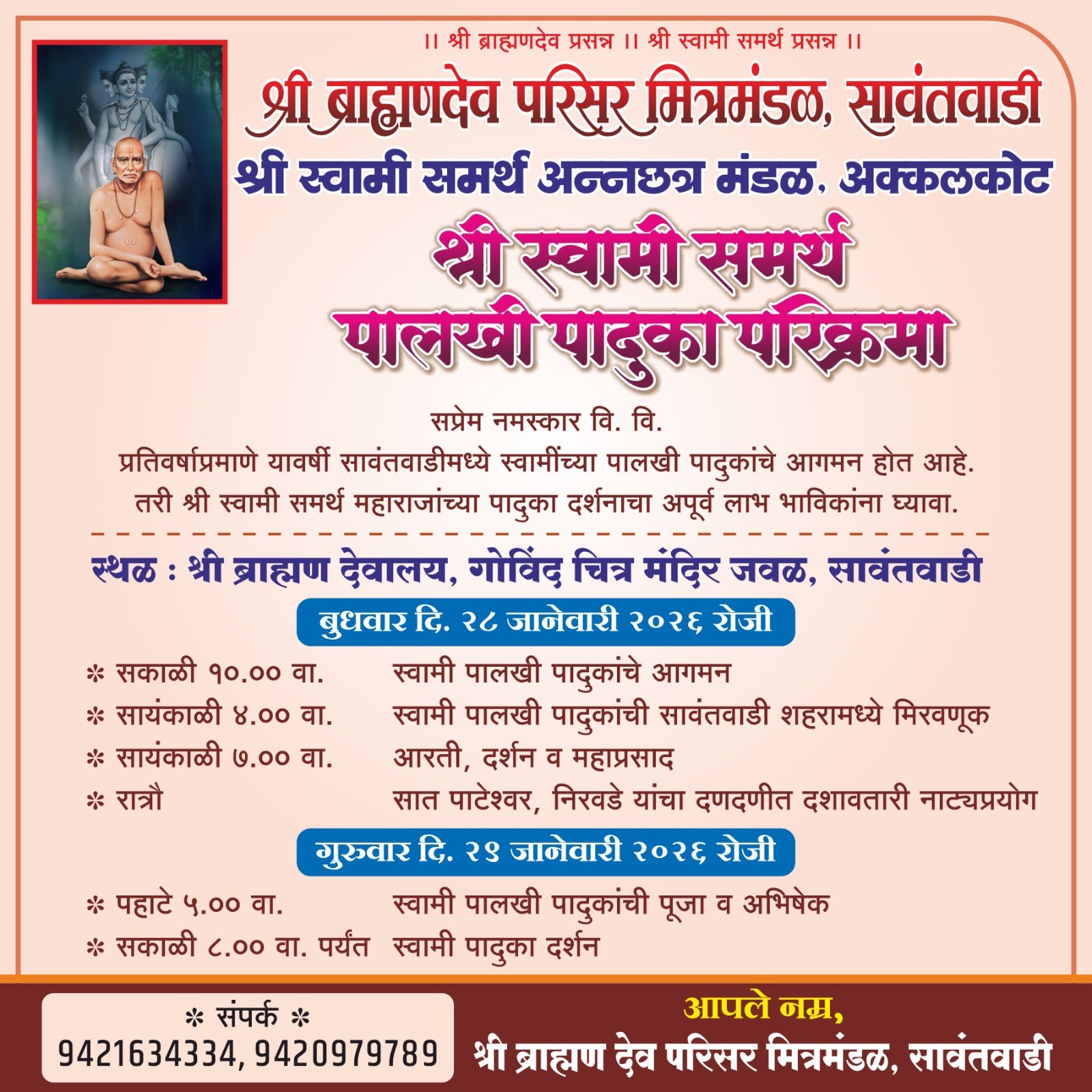 सावंतवाडी : श्री ब्राम्हणदेव परिसर मित्रमंडळ सावंतवाडी, श्री स्वामी समर्थ अन्नछत्र मंडळ अक्कलकोट श्री स्वामी समर्थ पालखी पादुका परिक्रमा कार्यक्रमाचे आयोजन करण्यात आले आहे. २ दिवस हा कार्यक्रम असणार आहे. बुधवार दिनांक २८ जानेवारी २०२६ रोजी सकाळी १० वाजता स्वामी पालखी पादुकांचे आगमन, सायंकाळी ४ वाजता स्वामी पालखी पादुकांची सावंतवाडी शहरामध्ये मिरवणूक, सायंकाळी ७ वाजता आरती, दर्शन व महाप्रसाद व रात्रौ सात पाटेकर, निरवडे यांचा दणदणीत नाट्यप्रयोग होणार आहे.गुरुवार २९ जानेवारी २०२६ रोजी पहाटे ५ वाजता स्वामी पालखी पादुकांची पूजा व अभिषेक, सकाळी ८ वाजेपर्यंत स्वामी पादुका दर्शन होणार आहे. असे २ दिवस कार्यक्रम होणार आहेत. तरी जास्तीत जास्त भाविक भक्तांनी या दर्शनाचा आणि प्रसादाचा लाभ घ्यावा असे श्री देव ब्राम्हण देव परिसर मित्रमंडळ भटवाडी, सावंतवाडी यांच्यावतीने आवाहन करण्यात आले आहे. अधिक माहितीसाठी, ९४२१६३४३३४, ९४२०९७९७८९ या क्रमांकावर साधायचा आहे..