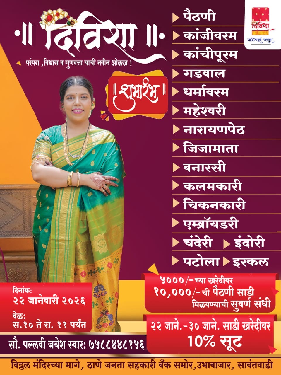 सावंतवाडी : परंपरा, विश्वास व गुणवत्ता यांची नवीन ओळख म्हणजे दिविशा साडी कलेक्शन.या दिविशा साडी कलेक्शन चा शुभारंभ २२ जानेवारी रोजी झाला होता. या साडी कलेक्शन मध्ये पैठणी, कांजीवरम, कांचीपुरम, गडवाल, धर्मावरम, महेश्वरी, नारायणपेठ, जिजामाता, बनारसी, कलमकारी, चिकनकारी, एम्ब्रायडरी, चंदेरी, इंदोरी, पटोला, इरकल अश्या प्रत्येक राज्यातील खास २० पेक्षा जास्त प्रकारच्या साड्या उपलब्ध आहेत. या शुभारंभ प्रसंगी २२ जानेवारी ते २४ जानेवारी पर्यंत विशेष ऑफर लावण्यात आली होती. मात्र ग्राहकांच्या वाढत्या मागणीनुसार ही ऑफर आता ३० जानेवारीपर्यंत वाढविण्यात आली आहे. ५००० च्या खरेदीवर १०, ००० ची पैठणी साडी मिळविण्याची सुवर्ण संधी पुन्हा एकदा उपलब्ध करण्यात आली आहे. तसेच प्रत्येक साडीवर ३० जानेवारीपर्यंत १०% सूट देण्यात येणार आहे. या सुवर्ण संधीचा जास्तीत जास्त महिलांनी लाभ घेण्याचे आवाहन या दिविशा साडी कलेक्शन च्या सर्वेसर्वा पल्लवी जयेश स्वार यांनी केले आहे. विठ्ठल मंदिरच्या मागे, ठाणे जनता सहकारी बँक समोर उभाबाजार सावंतवाडी असा या दिविशा साडी कलेक्शन चा पत्ता आहे. अधिक माहितीसाठी ७५८८४४८१५६ या क्रमांकावर साधावा अशी माहिती पल्लवी जयेश स्वार यांनी दिली..