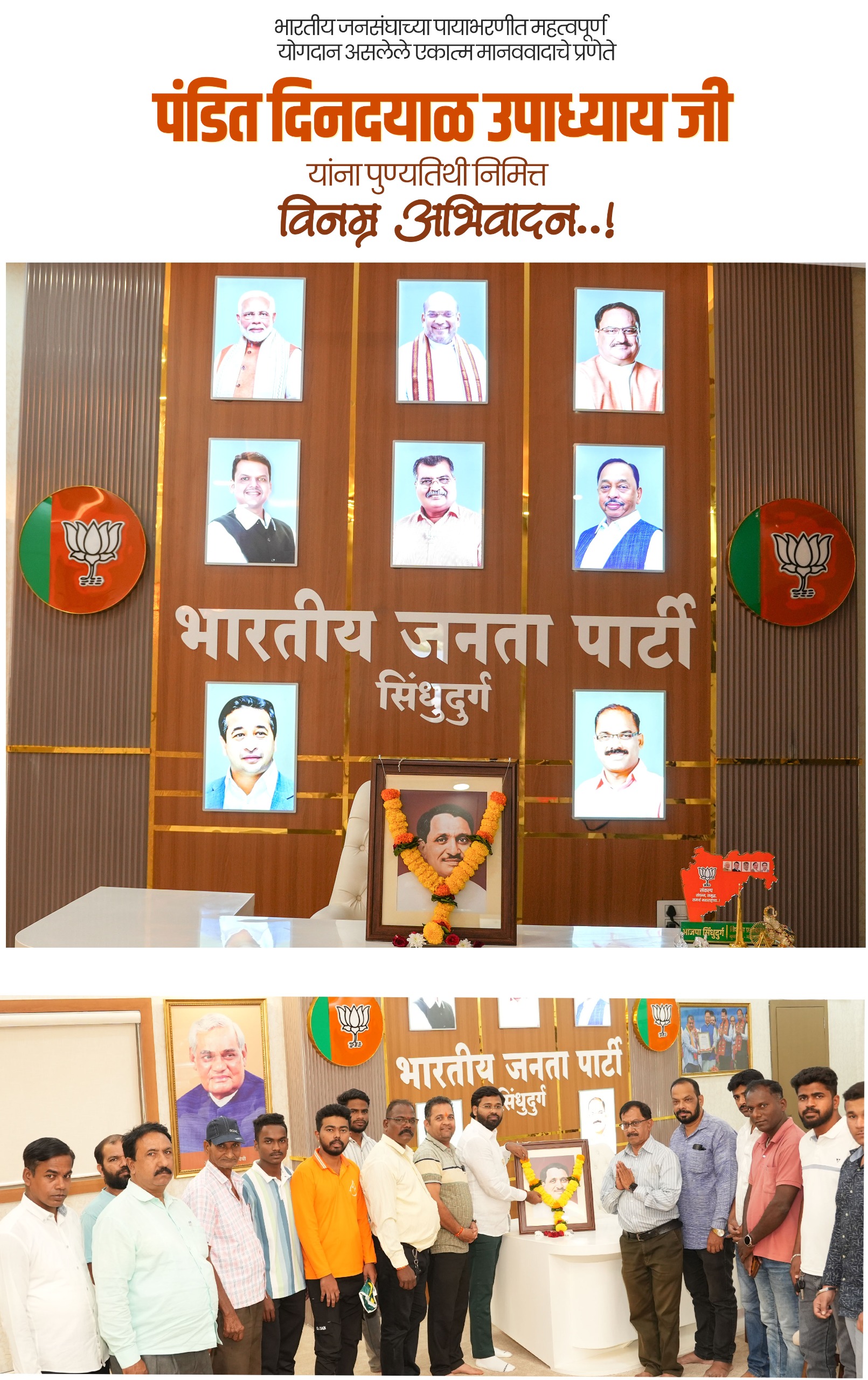 पंडित दीनदयाळ उपाध्याय स्मृती प्रित्यर्थ आज सावंतवाडी येथील भाजपा जनसंपर्क कार्यालयात समर्पण दिवस साजरा करून त्यांना आदरांजली अर्पण करण्यात आली. सर्वप्रथम भाजपा युवानेते विशालजी परब यांच्या हस्ते पंडित दीनदयाळ उपाध्याय यांच्या प्रतिमेस पुष्पहार अर्पण करण्यात आला. सहसंयोजक केतन आजगांवकर यांनी पंडित दीनदयाळ उपाध्याय यांच्या कार्याची महती विषद केली व कार्याचे स्मरण केले. यावेळी भाजपा युवानेते विशालजी परब, सहसंयोजक केतन आजगांवकर, मळेवाड उपसरपंच हेमंत परब, आजगाव शक्ती केंद्र प्रमुख ओंकार प्रभू, गिरीष परब, बंड्या दळवी, भाजपा राज्य सोशल मिडिया प्रमुख अविनाश पराडकर आदी उपस्थित होते.