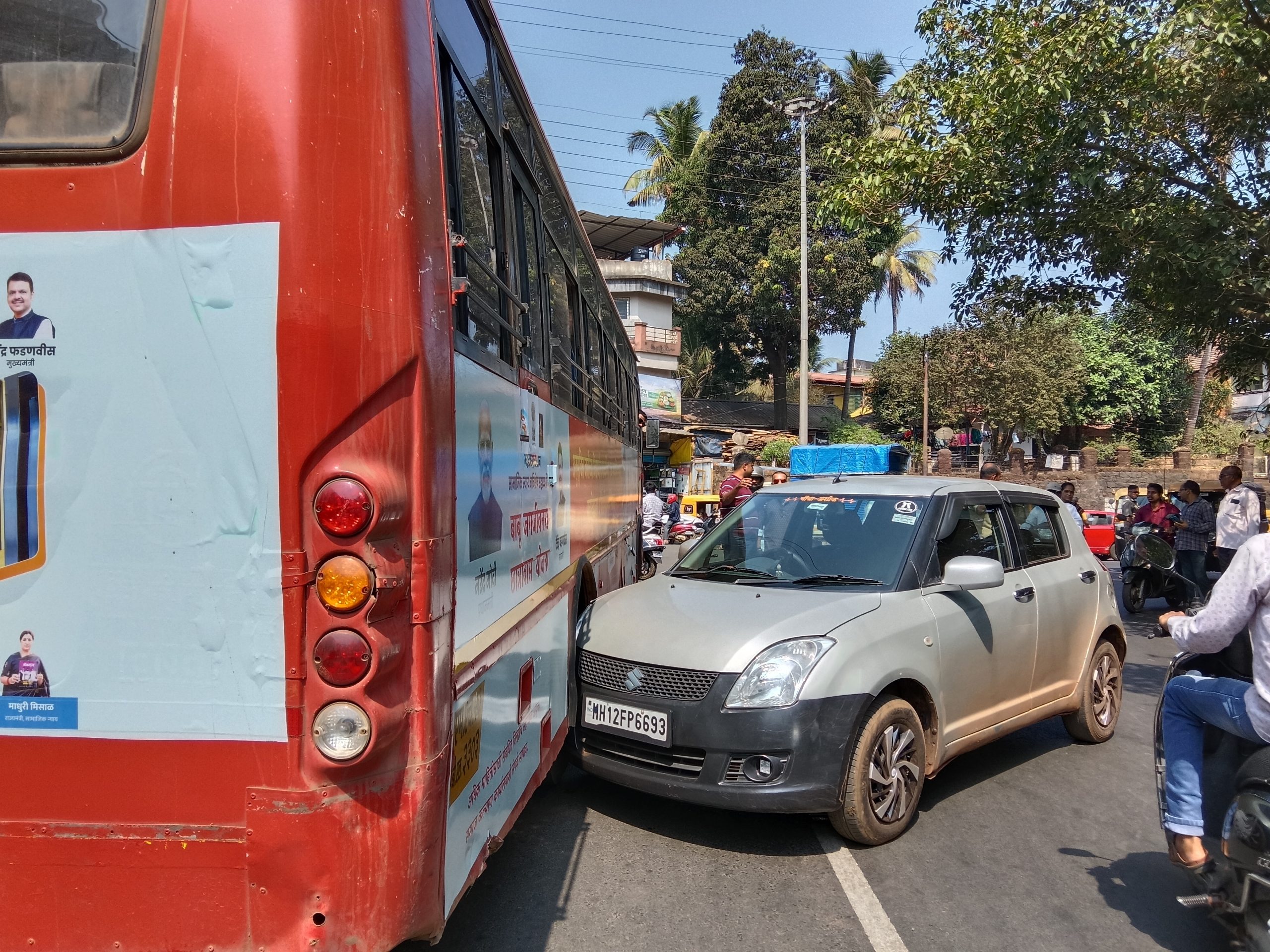 सावंतवाडी कोर्ट परिसरात चारचाकी आणि एस. टी. बस यामध्ये विचित्र अपघात पाहायला मिळाला. एम. एच. १२एफ पी. ६६९३ क्रमांकाची गाडी थेट एस. टी. बसवर आदळली. यात हैराणीची गोष्ट अशी की त्या चारचाकी गाडीमध्ये चालक नव्हता. हँडब्रेक न लावल्याने ही चारचाकी थेट एस. टी. बसला धडकली. चारचाकी च्या मालकाचा शोध चालू आहे. यामुळे या परिसरात ट्रॅफिक ची समस्या निर्माण होत आहे