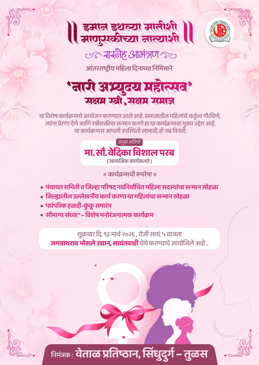 आंतरराष्ट्रीय महिला दिनाचे औचित्य साधत वेताळ प्रतिष्ठान, सिंधुदुर्ग-तुळस यांच्या वतीने “नारी आरोग्य महोत्सव – सक्षम स्त्री, सक्षम समाज” या विशेष कार्यक्रमाचे आयोजन करण्यात आले आहे.